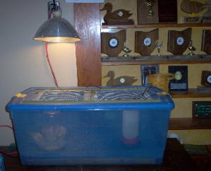 rubber shelf lining over the false floor, the ducklings can stay dry and have the